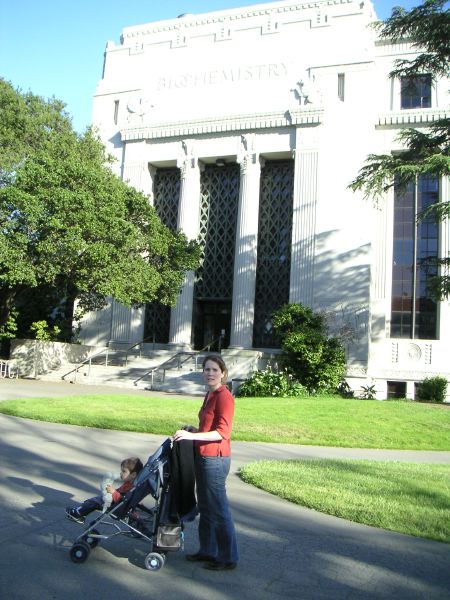 Une mère californienne typique avec son enfant devant le "life science building" de l'UC Berkeley.
